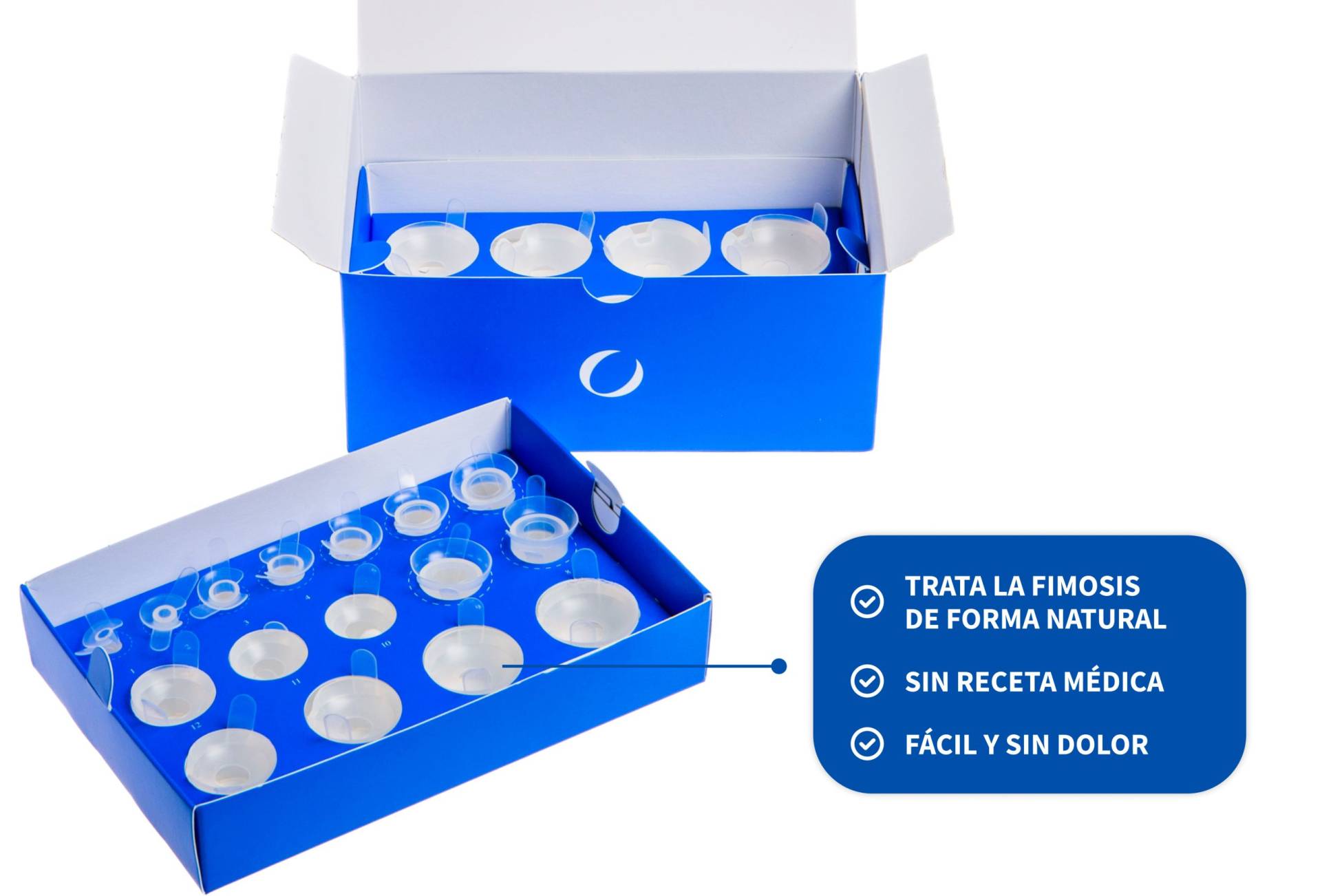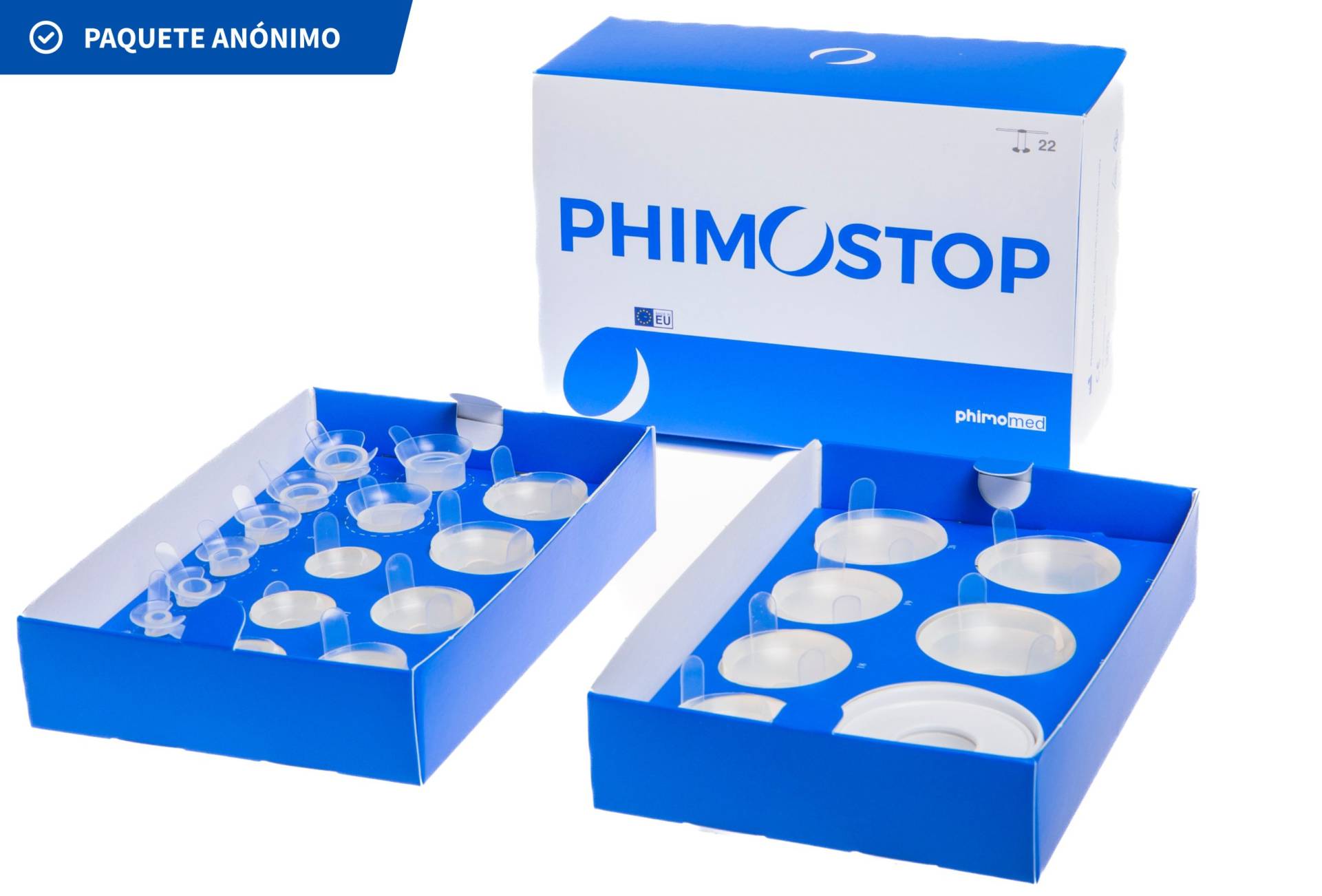 Phimostop está compuesto por 22 elementos de silicona médica, diseñados y fabricados para aplicar al anillo fimótico una técnica probada de dilatación de la piel al someterla a una presión progresiva y constante.